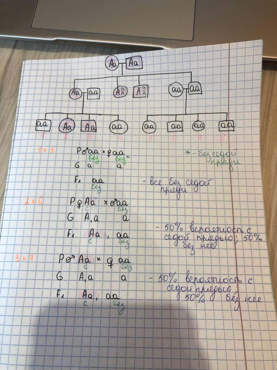 В семейной родословной (рис.2) встречается седая прядь волос, которая наследуется по доминантному типу. Определите, какие потомки будут от брака кузенов: 1 х 5, 2 х 6, 3 х 7.