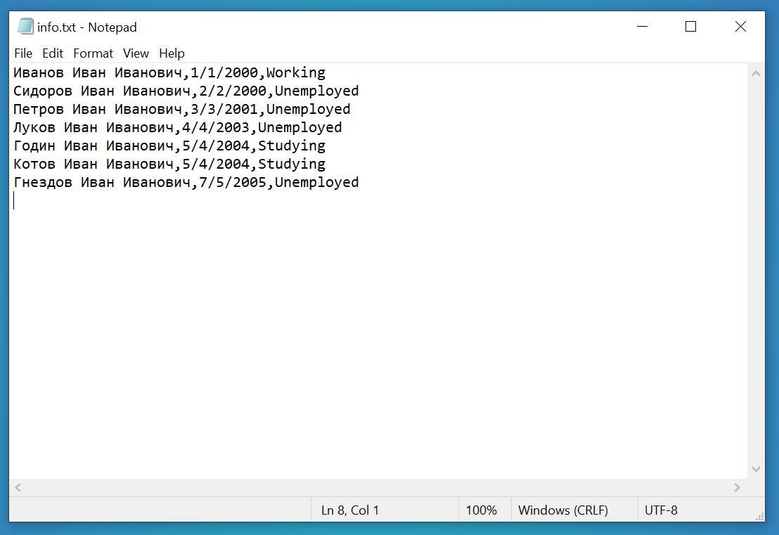 return $"{FullName} {Birth.ToShortDateString()} {Activity}";