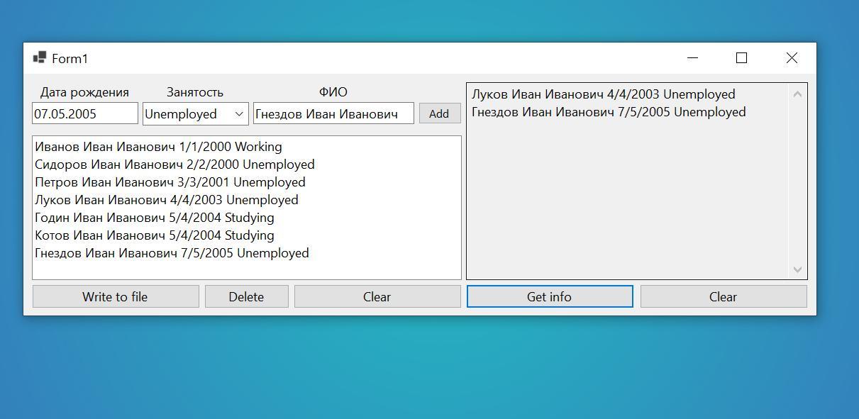 BirthTextBox.Text, ActivityComboBox.SelectedItem.ToString());