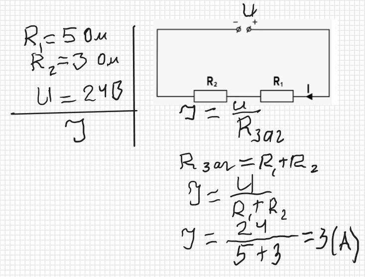 Резистори, опори яких 5 і 3 Ом, з’єднані послідовно й підключені до джерела постійної напруги 24 В. Знайдіть силу струму в колі.