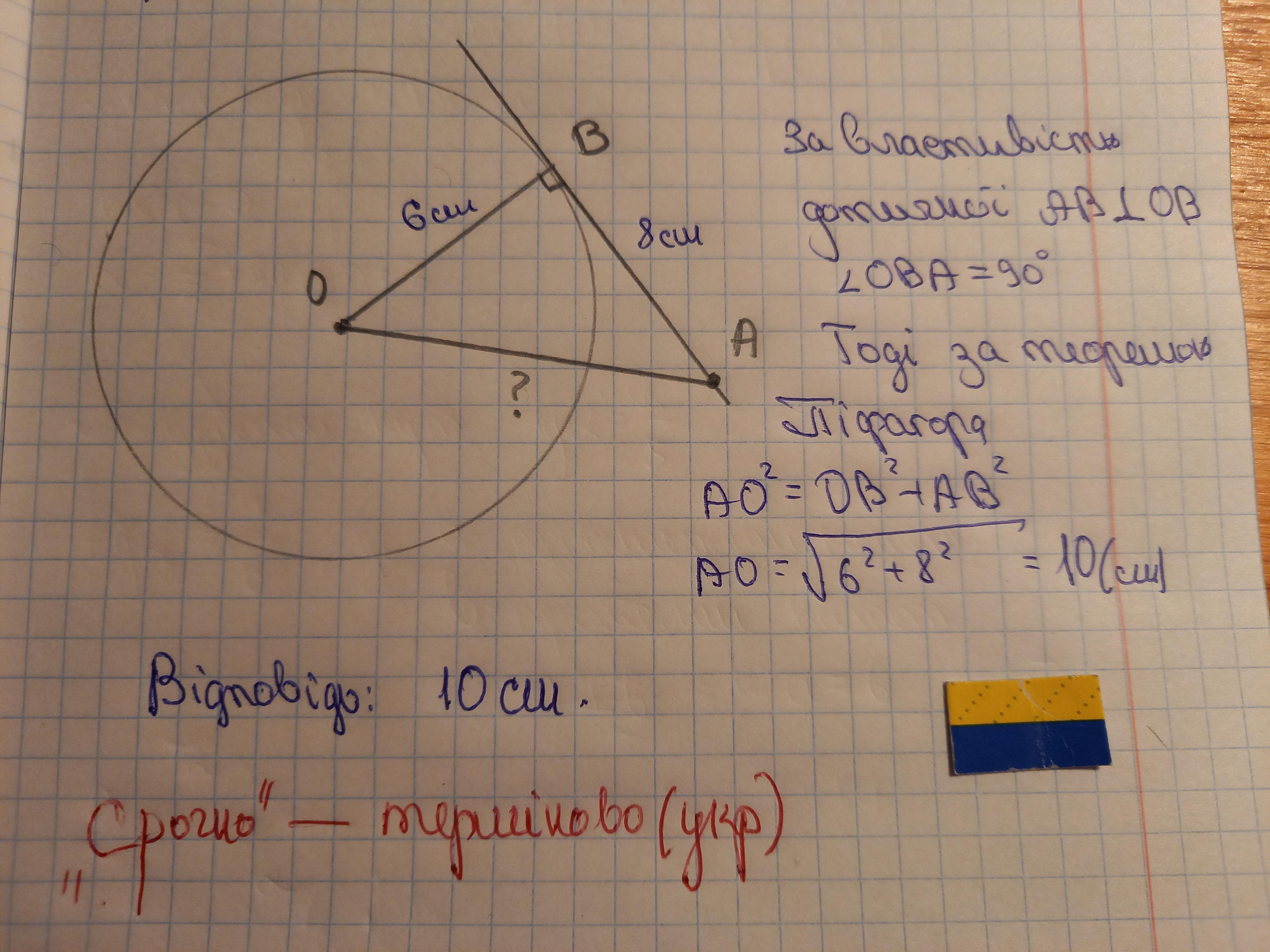 від точки А до центра кола, якщо AB = 8 см, OB = 6 см.