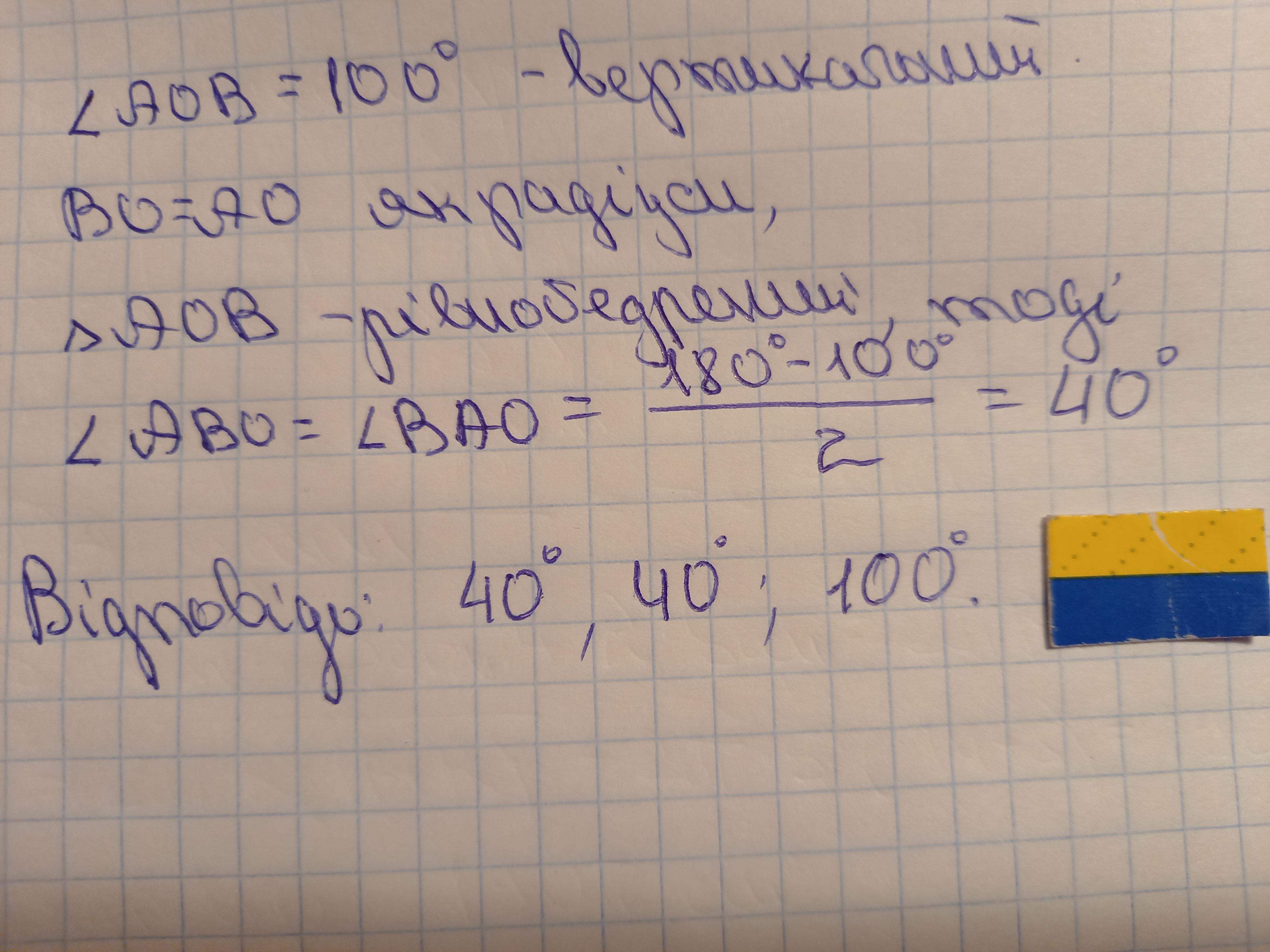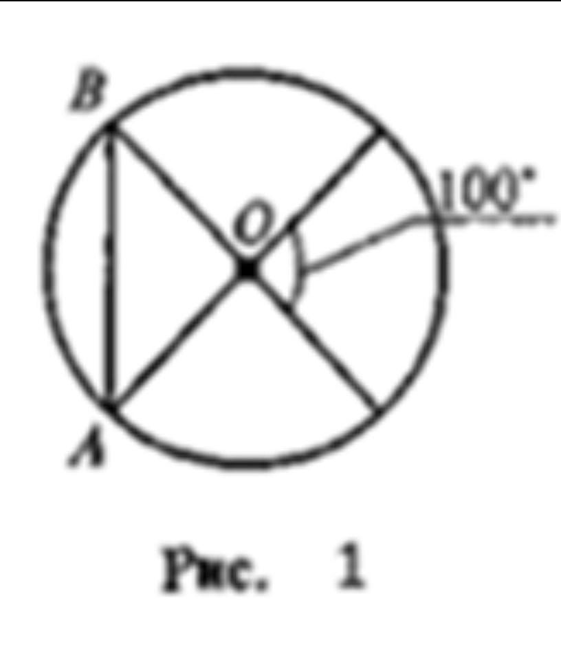 ∠АОВ=100°- по свойству вертикальных, т.к. ВО=АО,- как радиусы одной окружности, то ∠ОВА=∠ОАВ=(180°-100°)/2=40°