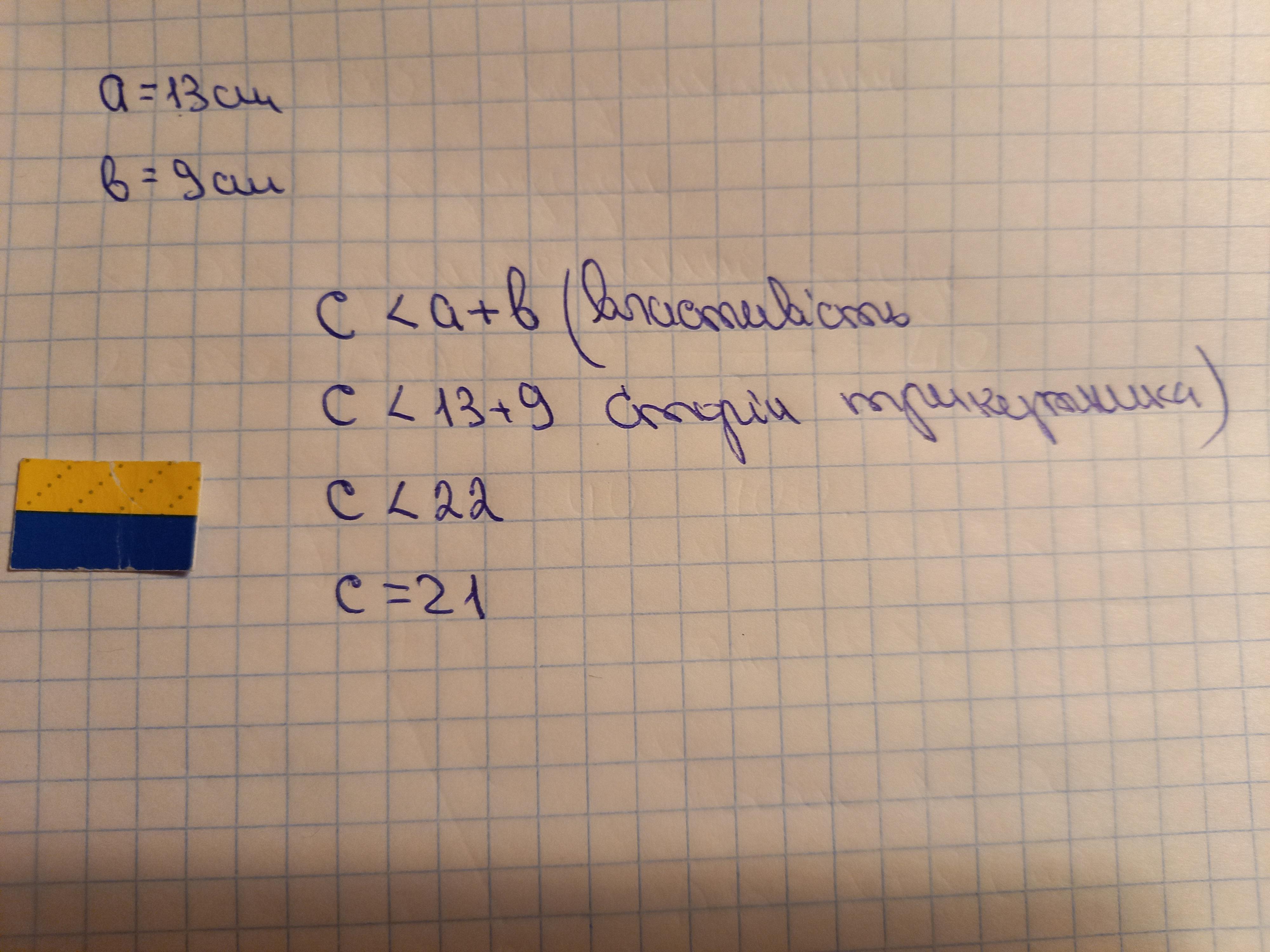 Дві сторони трикутника дорівнюють 13см і 9см.Якому найбільшому цілому числу сантиметрів може дорівнювати третя сторона