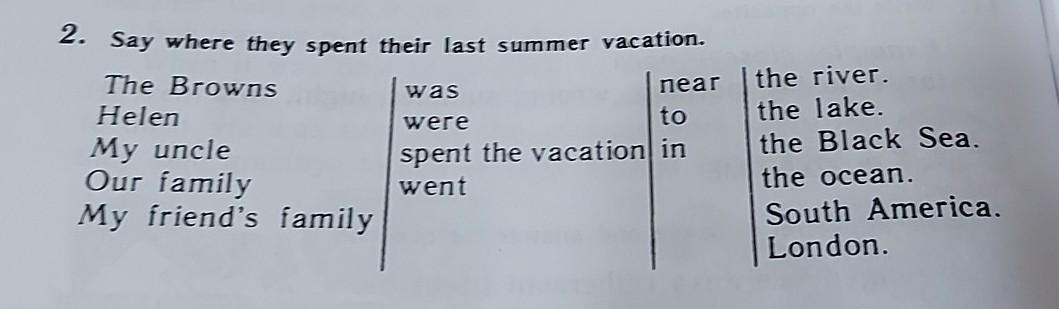 2. Say where they spent their last summer vacation. The Browns was near the river. Helen were to the lake. My uncle spent the vacation in the Black Sea. Our family went the ocean. My friend's family South America. London.