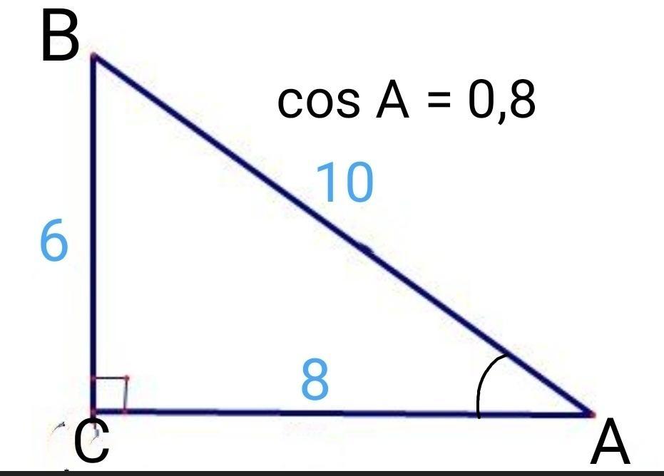 ⇒ гипотенуза = 8 см / 0,8 = 10 см