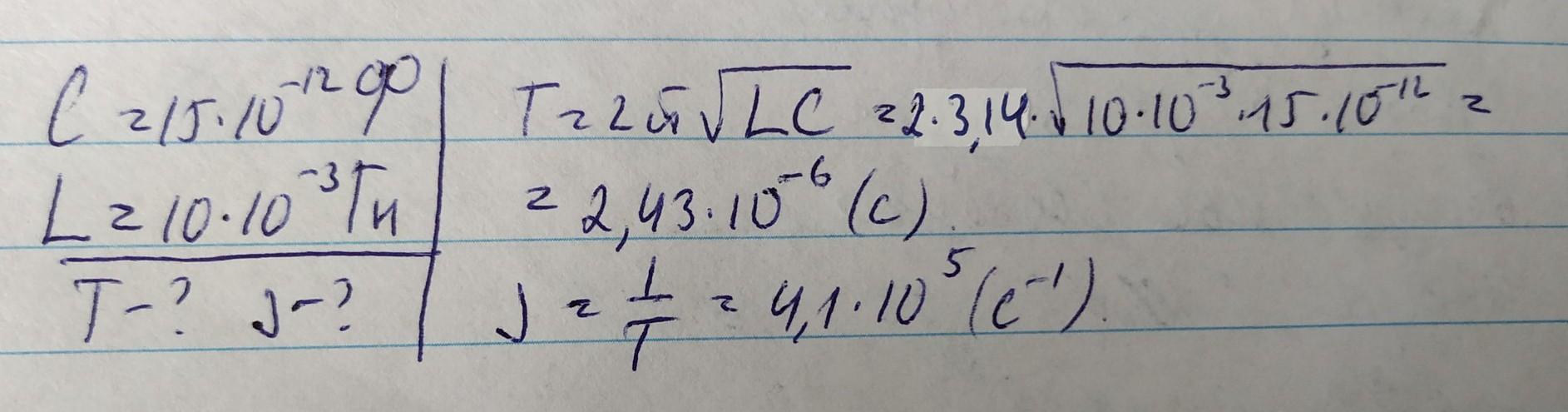 определите период и частоту электромагнитных колебаний в цепи состоящий из конденсатора ёмкостью 15 пФ и катушки индуктивностью 10 мГн.