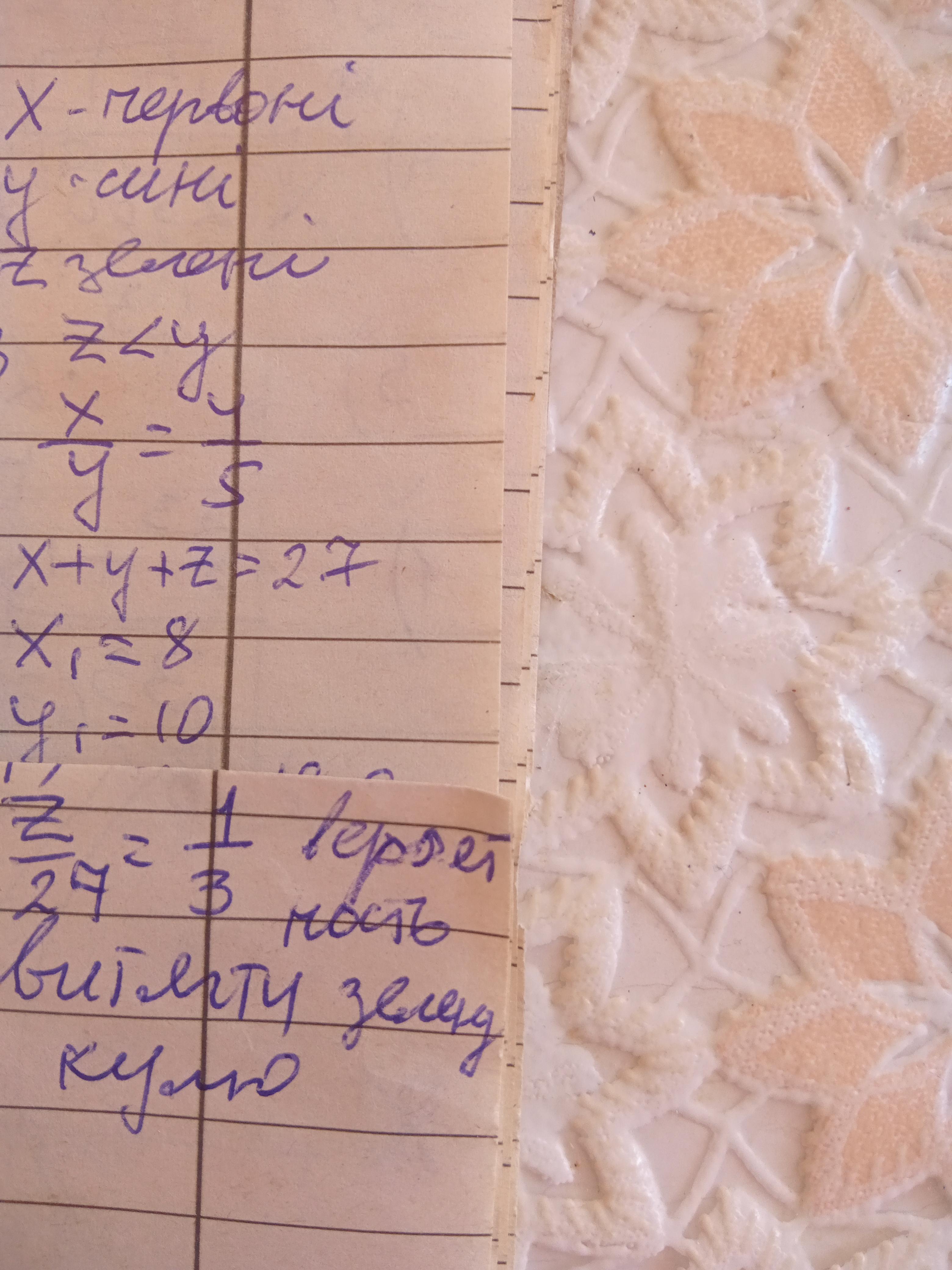 У коробці є червоні, сині і зелені кульки, причому зелених менше ніж синіх. Кількість червоних відноситься до кількості синіх як 4:5 . Всього у коробці 27 кульок. Знайти імовірність витягти зелену кульку