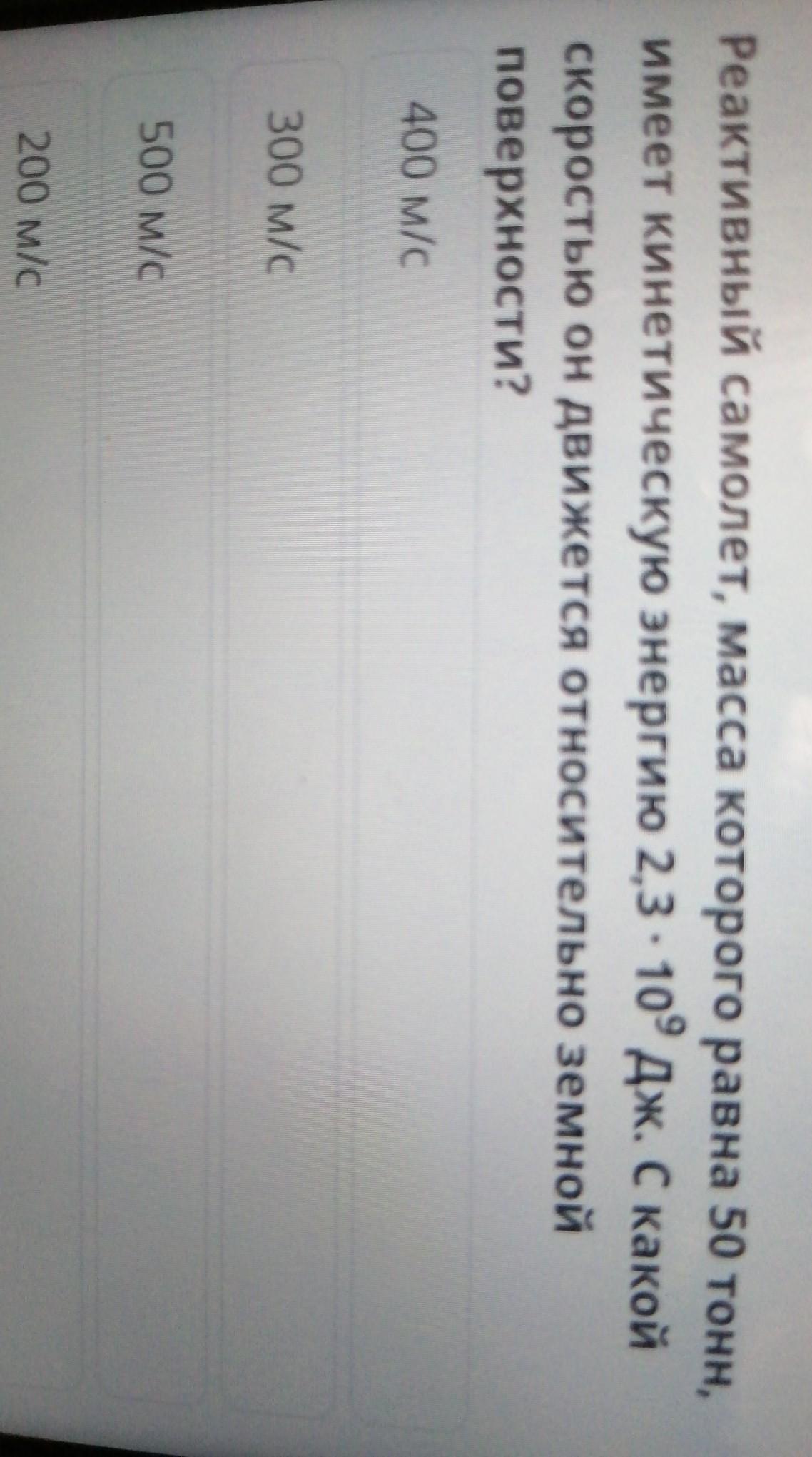 энергия Реактивный самолет, масса которого равна 50 тонн, имеет кинетическую энергию 2,3 *109Дж. С какой скоростью он движется относительно земной поверхности? 500 м/с 400 м/с 200 м/с 300 м/с