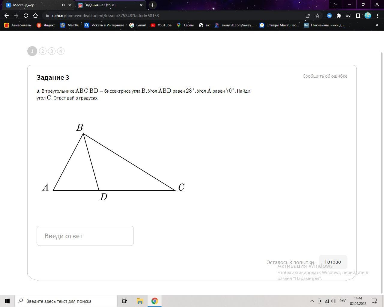 Угол А равен 70°.