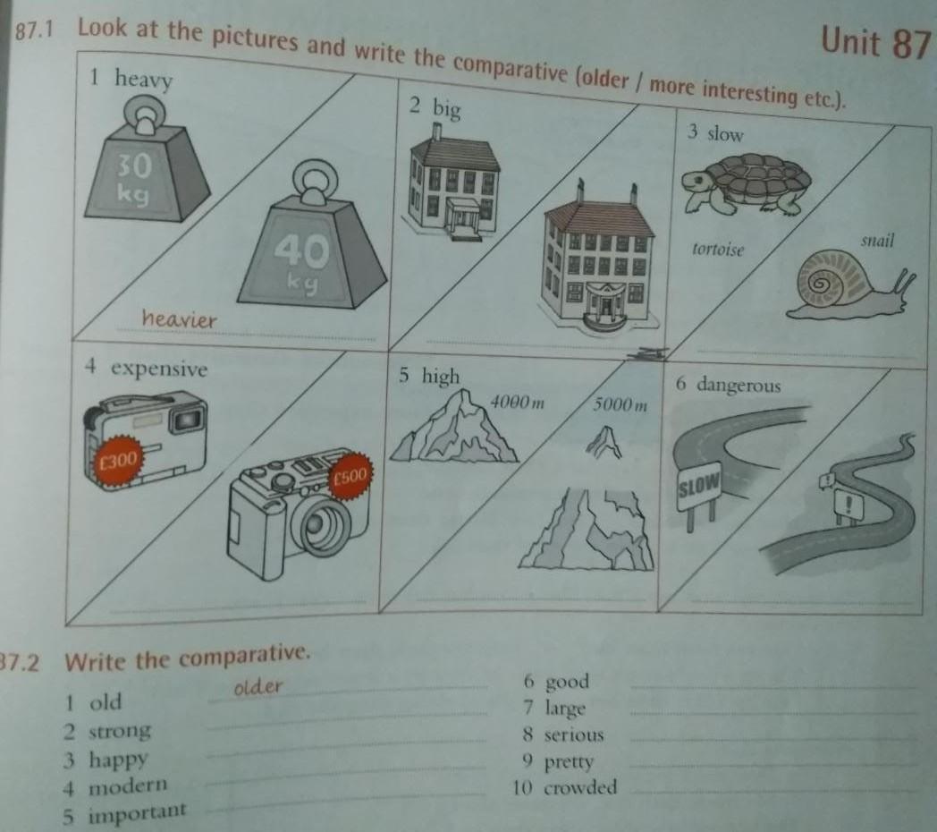 1) heavy - heavier, big - bigger, slow - slower, expensive - more expensive, high - higher, dangerous - more dangerous