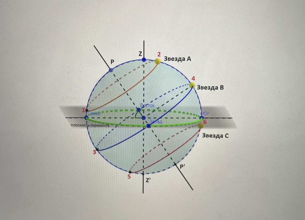 На рисунке показано положение небесной сферы для наблюдателя, находящегося в северном полушарии. В течение дня наблюдатель, находящийся в центре сферы, интересуется движением трех звезд А, В и С.