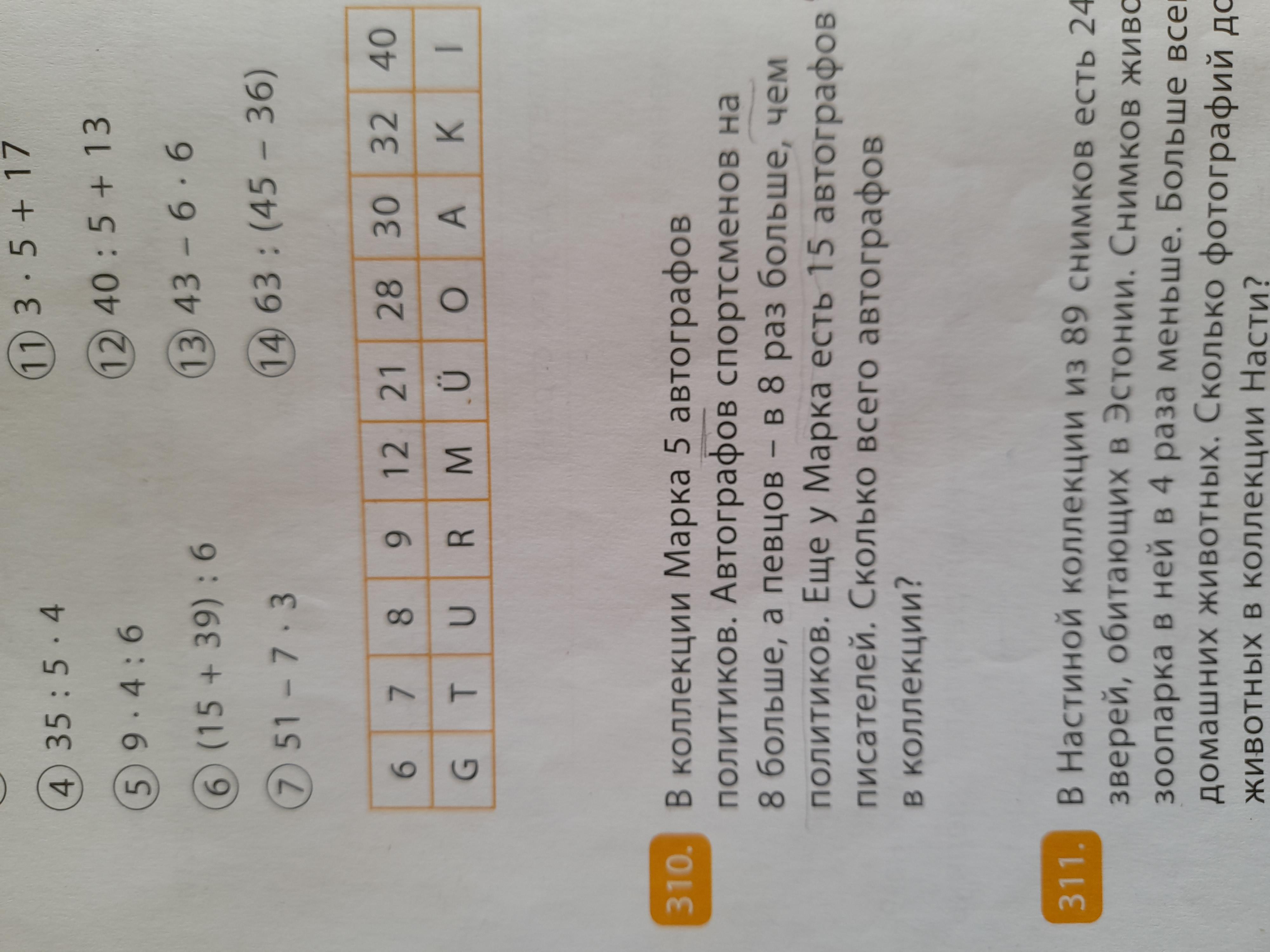 В коллекции Марка 5 автографов политиков.Автографов спортсменов на 8 больше,а певцов - в 8 раз больше чем политиков.Ещё у Марка есть 15 автографов писателей.Сколько всего автографов в коллекции? Задание номер 310