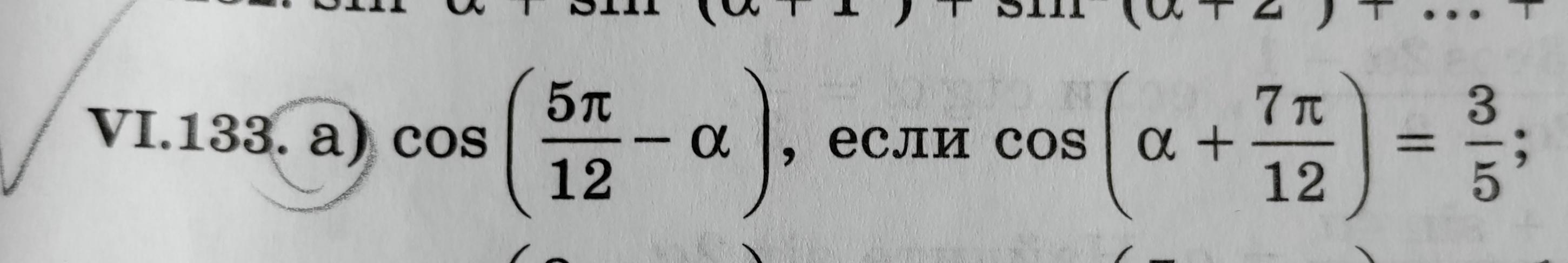 \displaystyle\bf\\Cos\bigg(\alpha +\frac{7\pi }{12} \bigg)=\frac{3}{5}\\\\\\Cos\bigg(\frac{5\pi }{12} -\alpha \bigg)=Cos\bigg[\pi -\bigg(\frac{7\pi }{12} +\alpha \bigg)\bigg]=-Cos\bigg(\frac{7\pi }{12} +\alpha \bigg)=-\frac{3}{5} \\\\\\Otvet: \ Cos\bigg(\frac{5\pi }{12} -\alpha \bigg)=-\frac{3}{5}