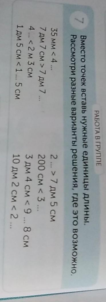 РАБОТА В ГРУППЕ 7 Вместо точек вставь нужные единицы длины. Рассмотри разные варианты решения, где это возможно.