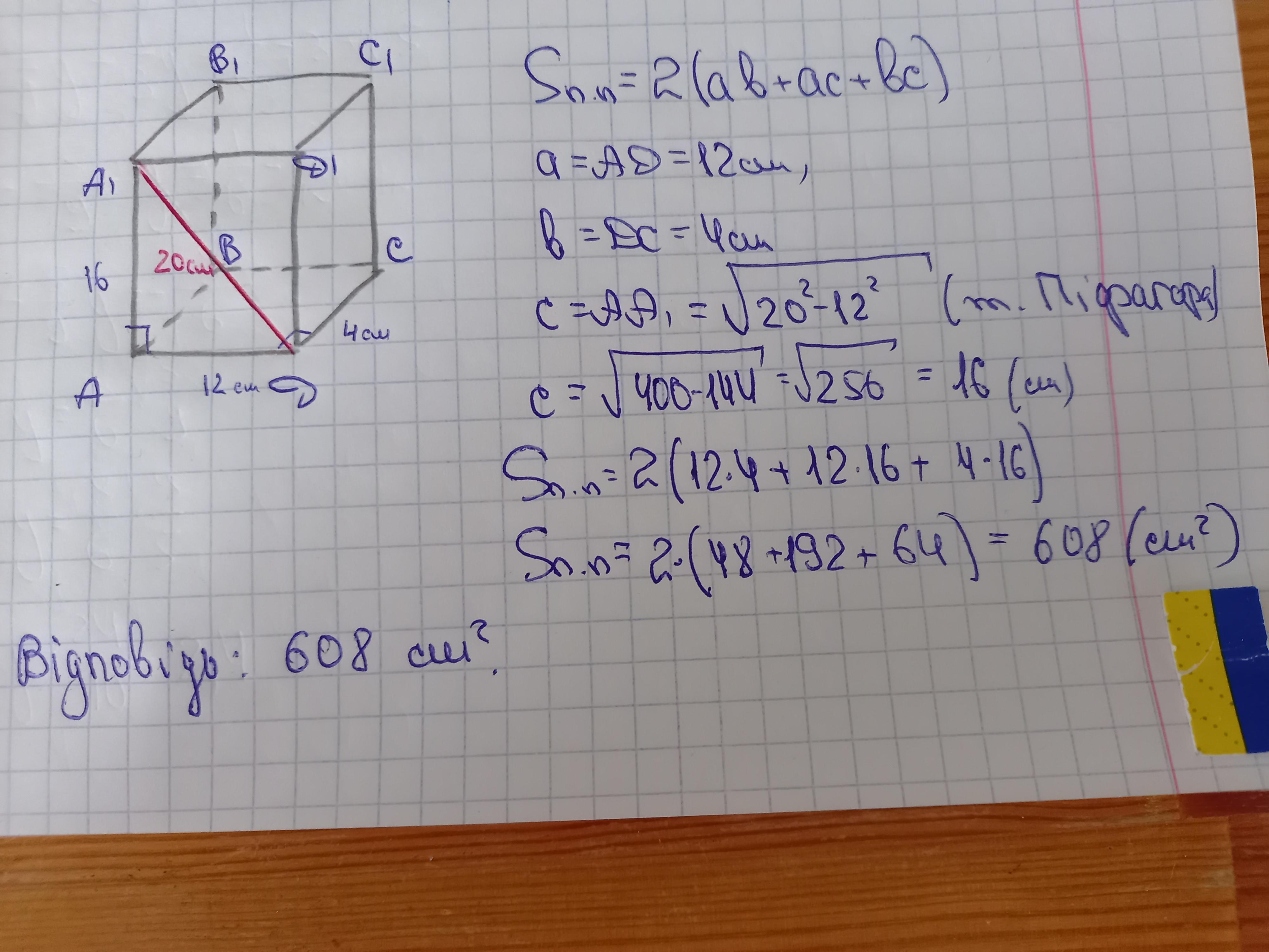 АВСДА1В1С1Д1 - пряма призма, в основі якої лежить прямокутник із сторонами 12см і 4см. Діагональ бічної грані, що містить сторону 12см дорівнює 20 см. Знайти площу повної поверхні призми.