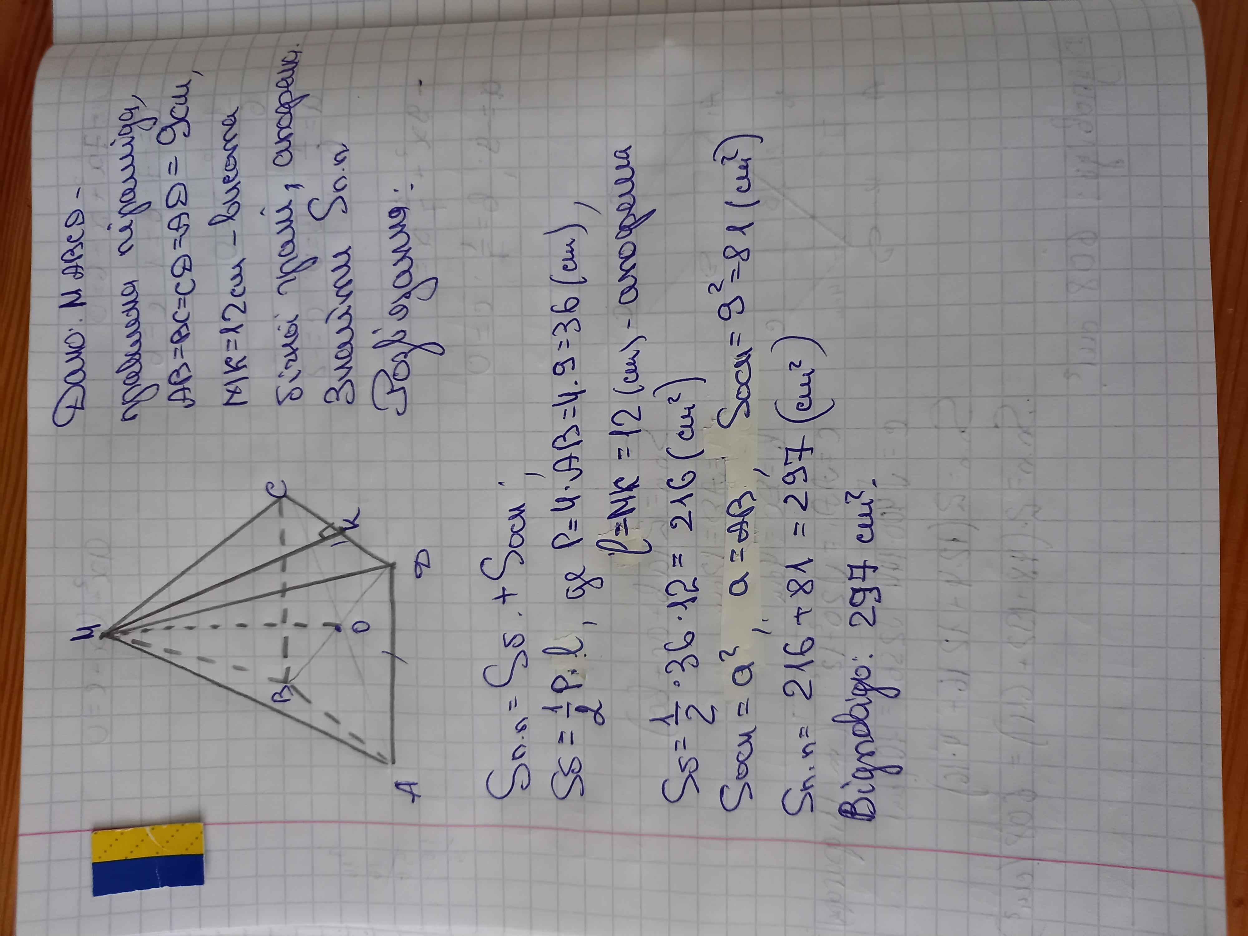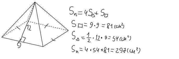 Знайти площу повної поверхні правильної чотирикутної піраміди, якщо ребро основи дорівнює 9 см, а висота бічної грані 12см