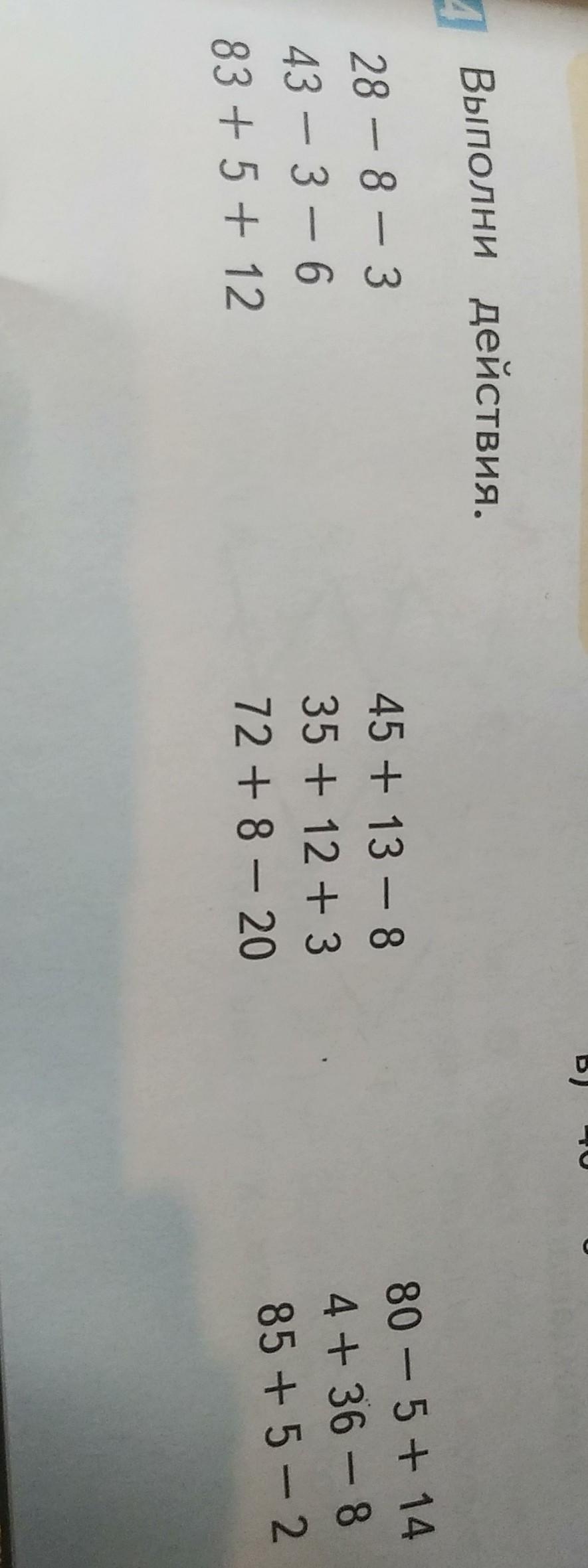 Выполни действия. - 28 - 8 - 3 43 – 3 – 6 83 + 5 + 12 - 45 + 13 - 8 35 + 12 + 3 72 +8 - 20 80 - 5 + 14 4 + 36 - 8 85 +5 - 2