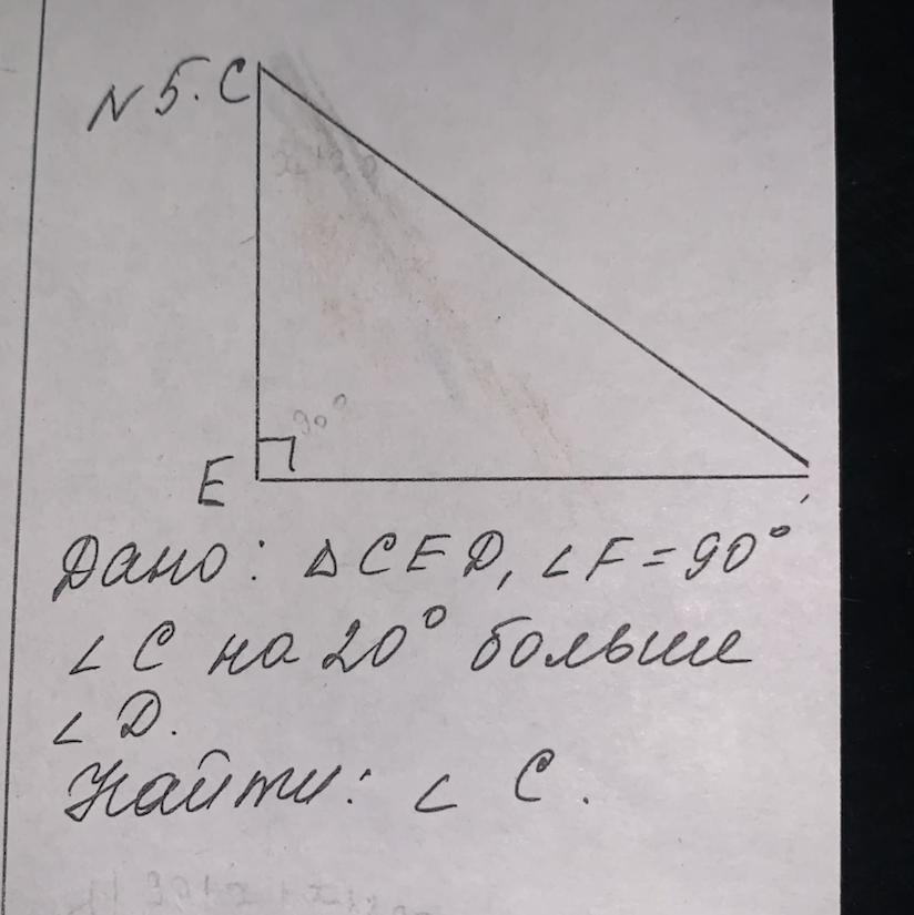 Дано: треугольник CED, угол F=90 градусов угол C на 20 градусов больше угла D.Найти угол С