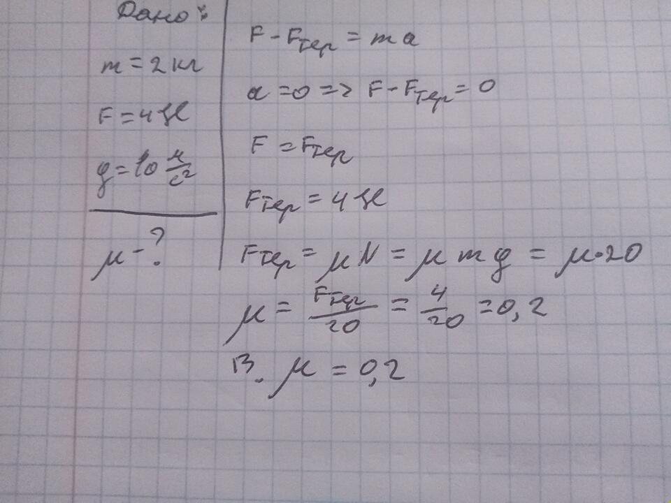 Щоб рівномірно рухати столу тіла масою 2 кг треба прикласти горизонтальну силу 4H чому дорівнює коефіцієнт тертя ковзання. Між тілом і столом