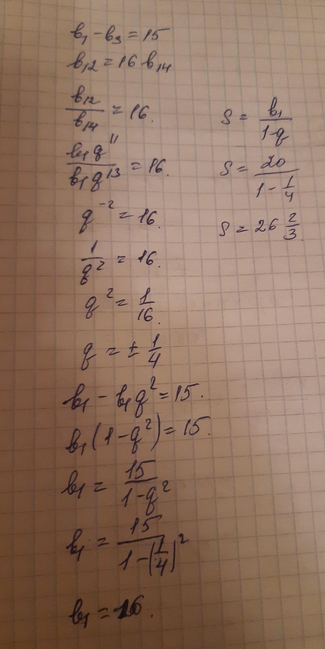 Знайдіть суму нескінченної геометричної прогресії (bn) із від'ємним знаменником, якщо b1-b3=15, b12=16*b14