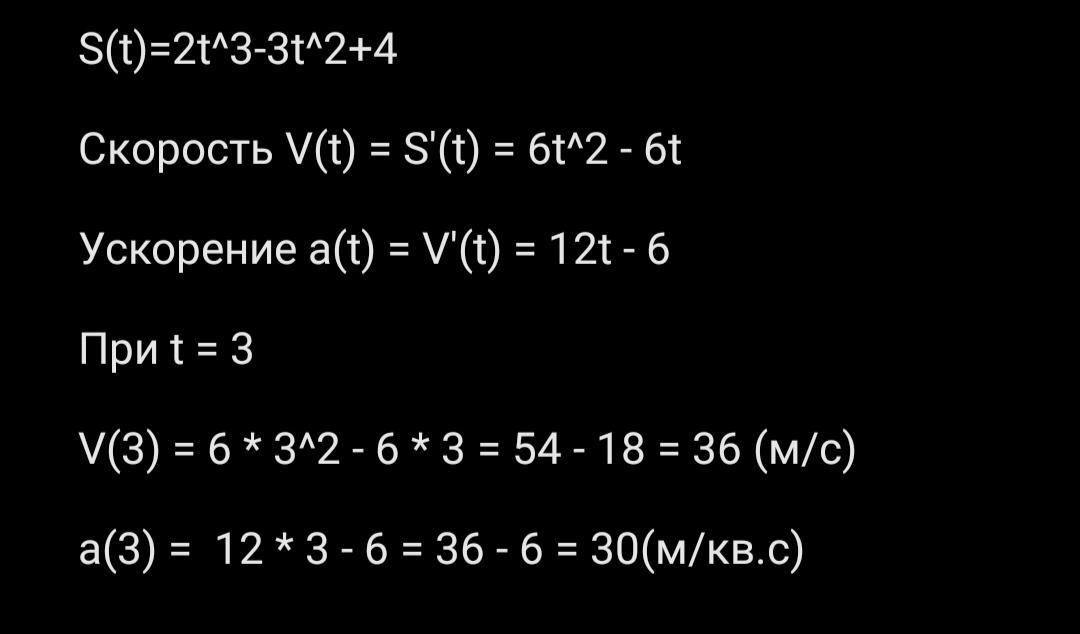 тело движется прямолинейно по закону s= 2t^3-3t^2+4. найдите скорость и ускорение точки при t= 3 сек