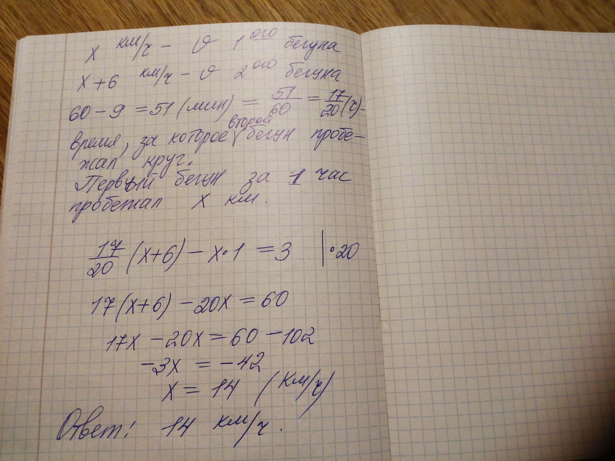 2 бегуна одновременно стартовали в одном направлении из одного и того же места круговой трассы в беге на несколько кругов. Спустя один час когда одному из них оставалось 3 км до окончания первого круга, ему сообщили, что второй бегун прошел первый круг 9 минут назад. Найдите скорость первого бегуна, если известно, что он на 6 км/ч меньше скорости второго.