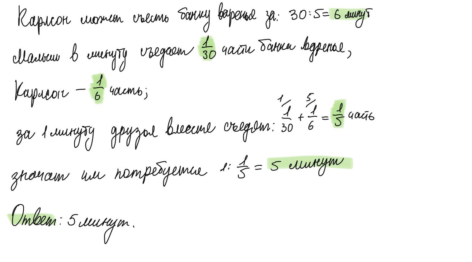 1/(1/5) = 1 * 5/1 = 5 минут — понадобится Малышу и Карлсону, чтобы съесть банку варенья.