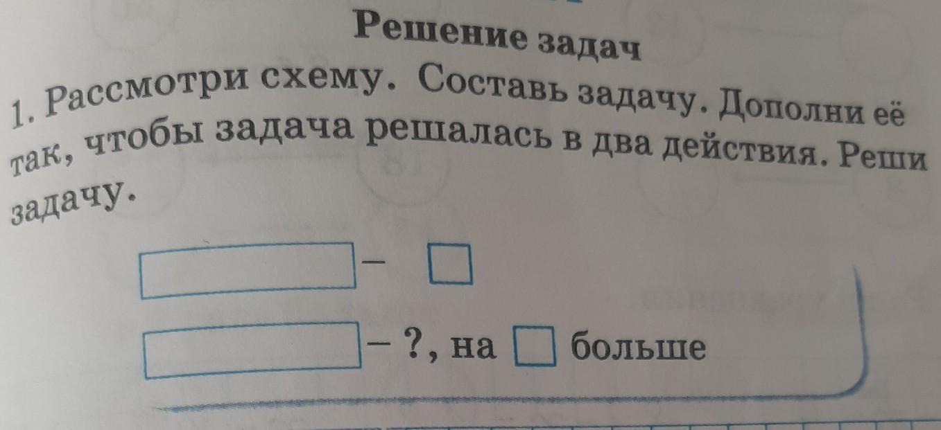 1. Рассмотри схему. Составь задачу. Дополни её так, чтобы задача решалась в два действия. Реши задачу.