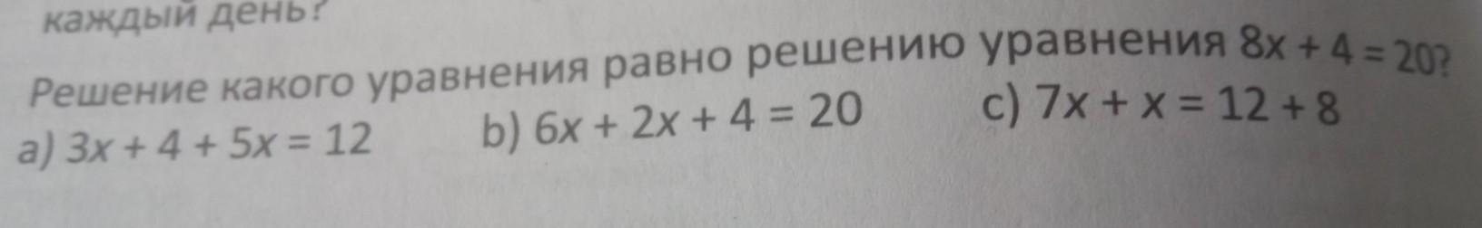 Решение какого уравнения равно решению уравнения 8х + 4 = 202 а) 3х + 4 + 5х = 12 b) 6х + 2х + 4 = 20 c) 7х + х = 12 + 8