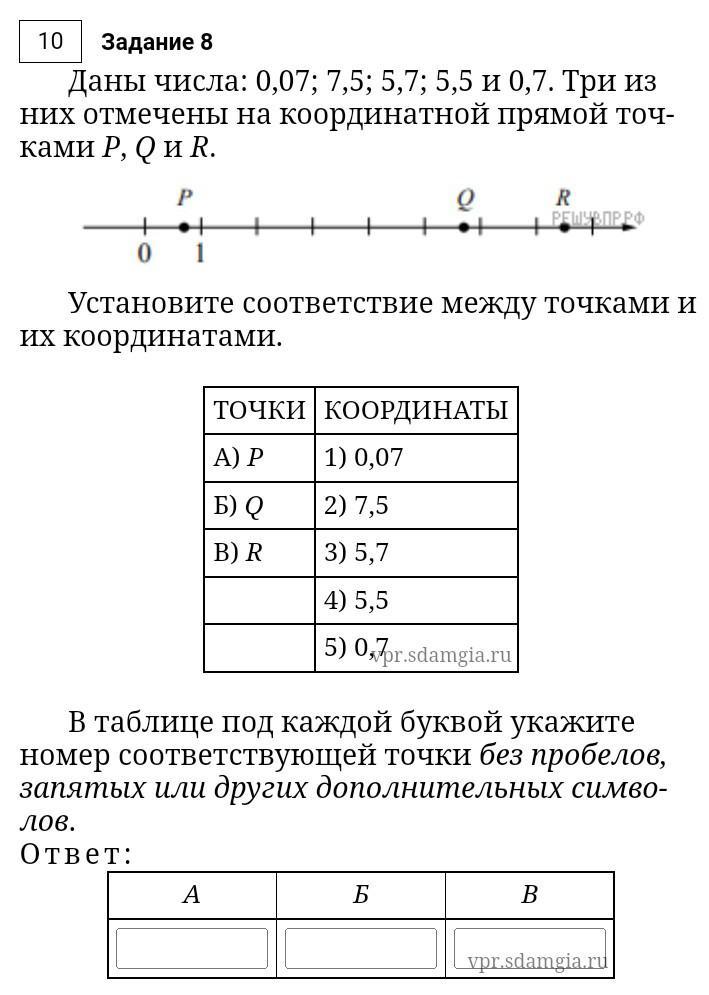 Даны числа: 0,07; 7,5; 5,7; 5,5 и 0,7. Три из них отмечены на координатной прямой точками P, Q и R.
