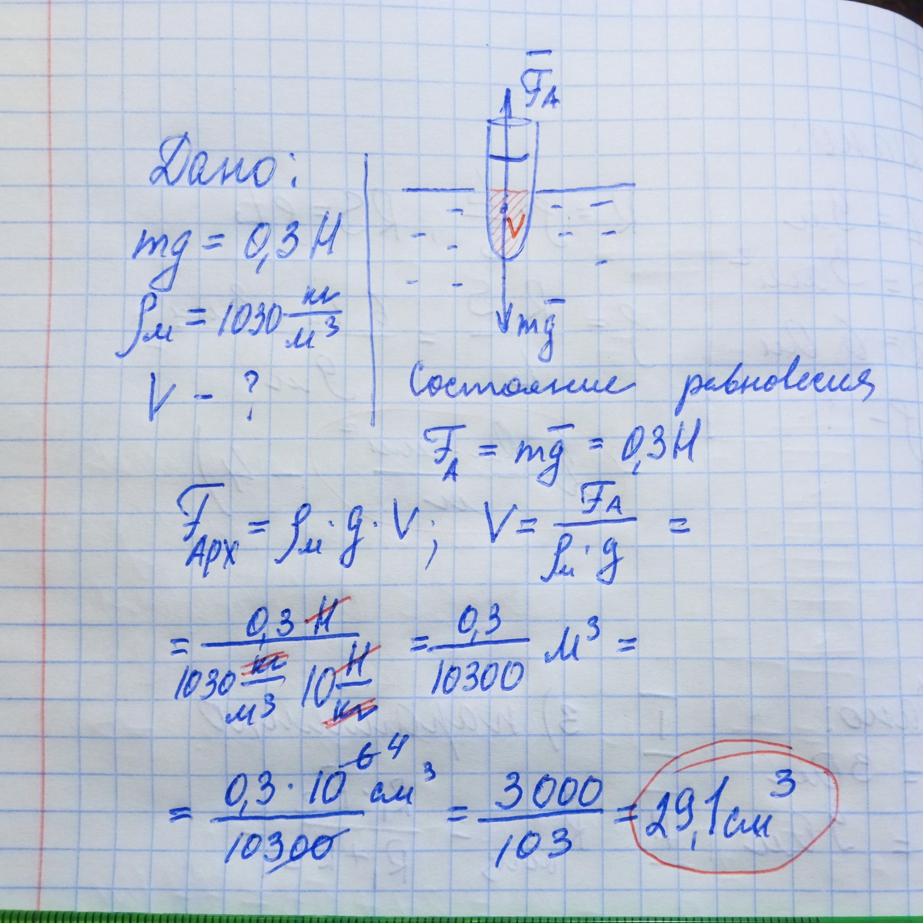 V = Fa / (рg) = 0,30/ (1036*10) = 0,00002895752 м³