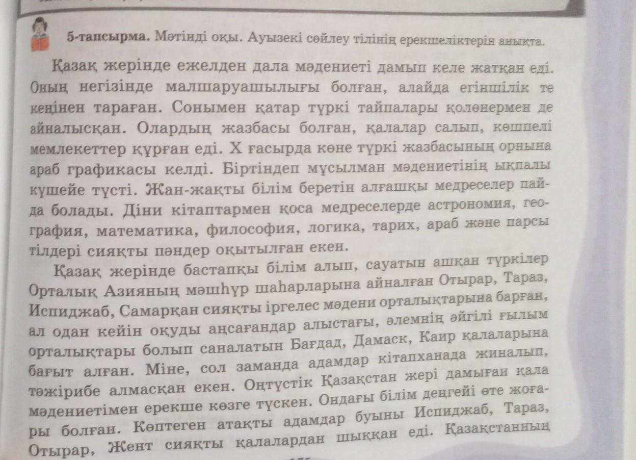 6-тапсырма. Сұрақтарға жауап бер. 1. Мәтін бойынша ойыңда не сақталып қалды? 2. Медреселерде қандай пәндер оқытылған? 3. Түркі ғалымдары қандай қалаларда білім алған екен? 4. Кітапхананың сол кезеңдердегі адамдар үшін маңызы қандай еді? Себебі неде? 5. Отырар кітапханасы туралы қандай мәлімет әсер қалдырды? Неліктен? Ойыңмен бөліс. 6. «Егер Отырар кітапханасы күлге айналмаса...» деген ойды бір сөйлеммен қалай жалғастырар едің?