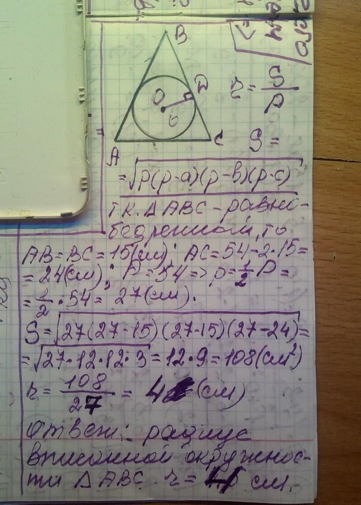 Найдите радиус вписанной окружности равнобедренного треугольника, боковая сторона которого 15 см, а периметр 54 см.