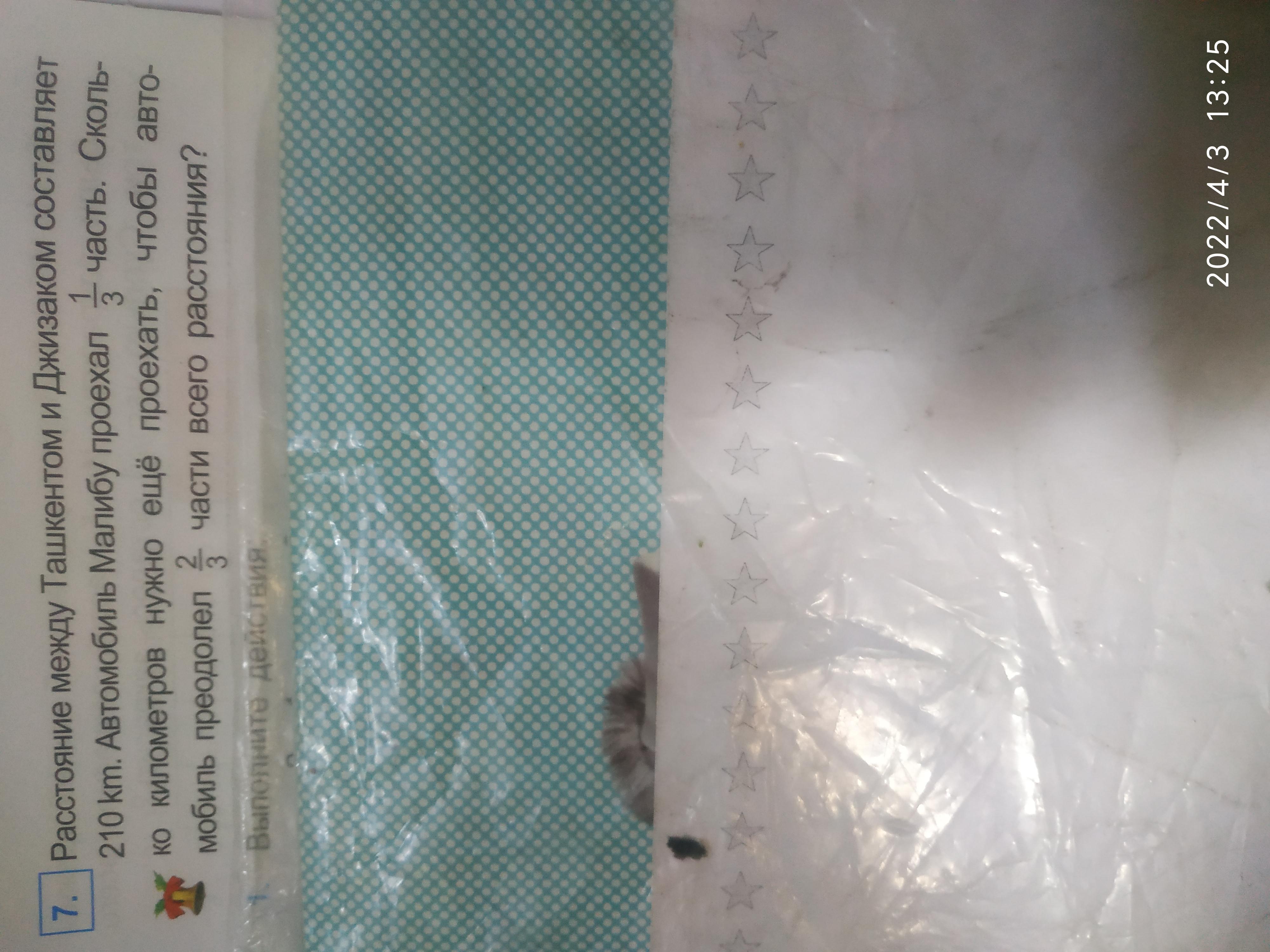 Пожалуйста помогите решить задачу для 3 класса. С условием. Расстояние между Ташкентом и Джизаком составляет 210 км. Автомобиль малибу проехал 1/3 часть. Сколько километров нужно еще проехать, чтобы автомобиль преодолел 2/3 части всего расстояния?