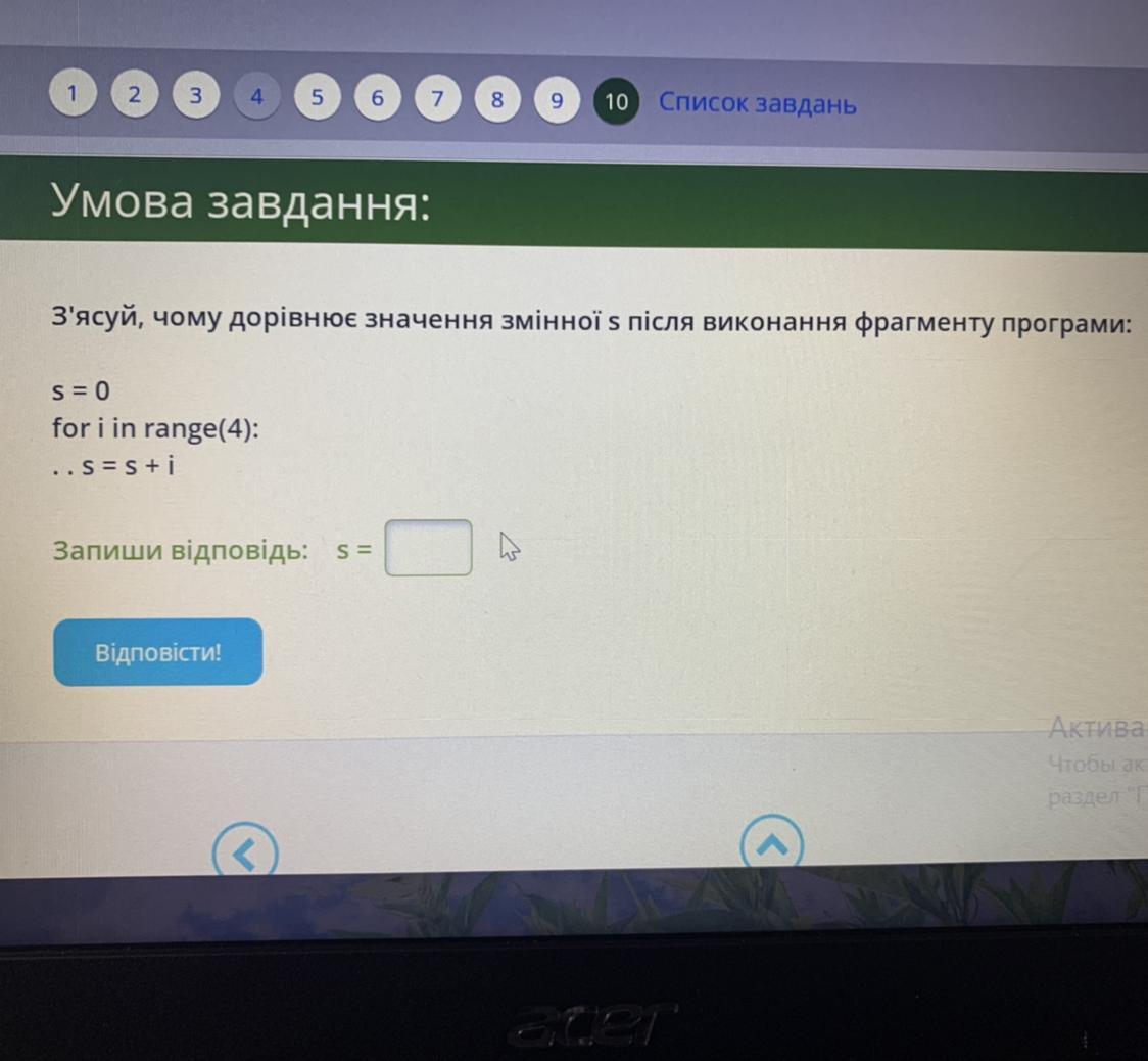 З'ясуй, чому дорівнює значення змінної s після виконання фрагменту програми: