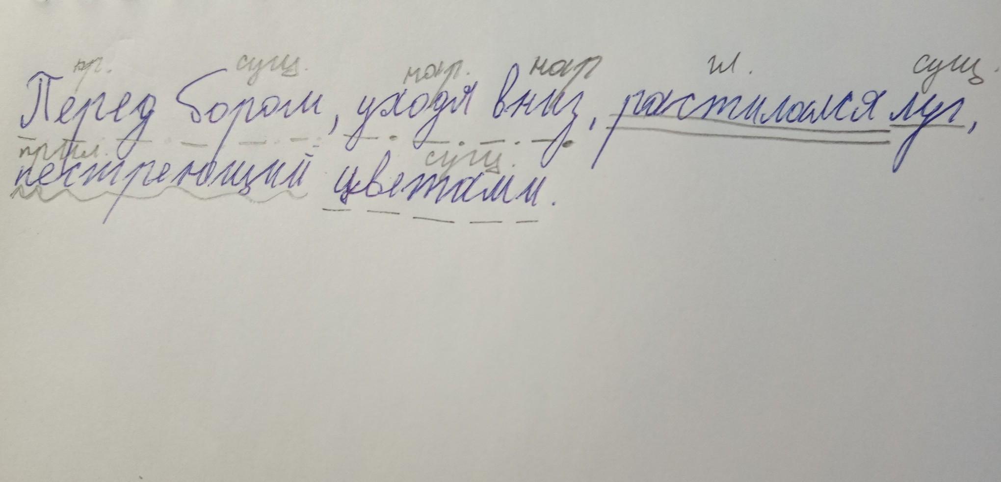 Сделать синтаксический разбор "Перед бором, уходя вниз, растилался луг, пестреющий цветами.