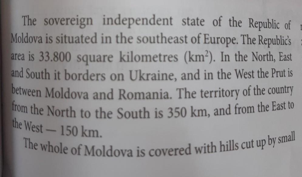 Вся Молдова покрыта небольшими холмами, изрезанными с севера на юг на 350 км, а с востока на восток. Суверенное независимое государство Республика Молдова расположено на юго-востоке Европы. Площадь республики составляет 33 800 квадратных километров (км2). На севере, востоке и юге граничит с Украиной, а на западе Прут находится между Молдавией и Румынией. Территория страны Запад- 150 км.