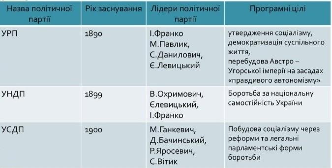 Заповнити таблицю " Формування українських партій на західноукраїнських землях."