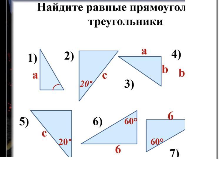 1-ый треу-к равен 3-ему треугольнику, 2-ой к 5, 6-ой к седьмому.