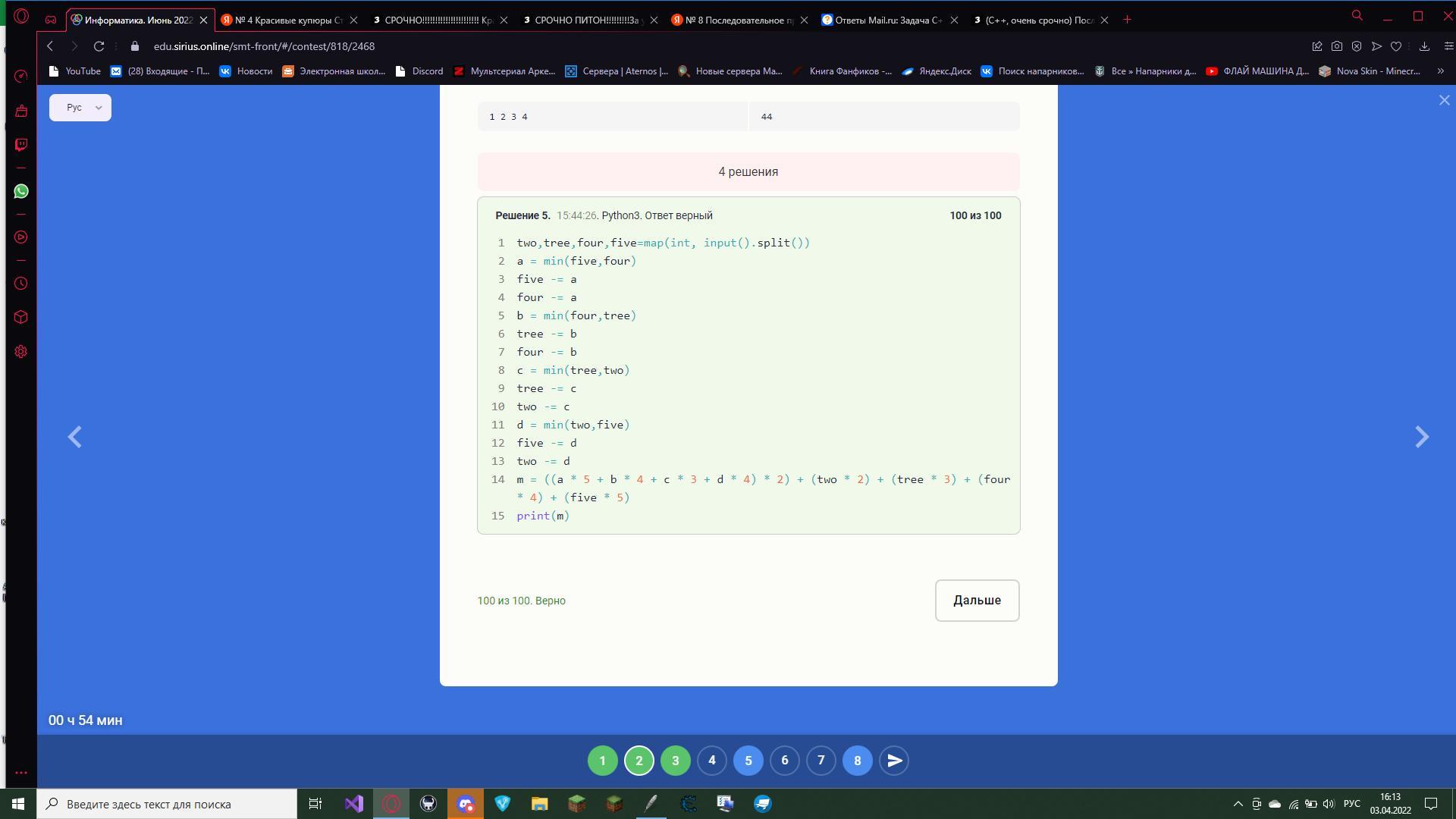 m = ((a * 5 + b * 4 + c * 3 + d * 4) * 2) + (two * 2) + (tree * 3) + (four * 4) + (five * 5)