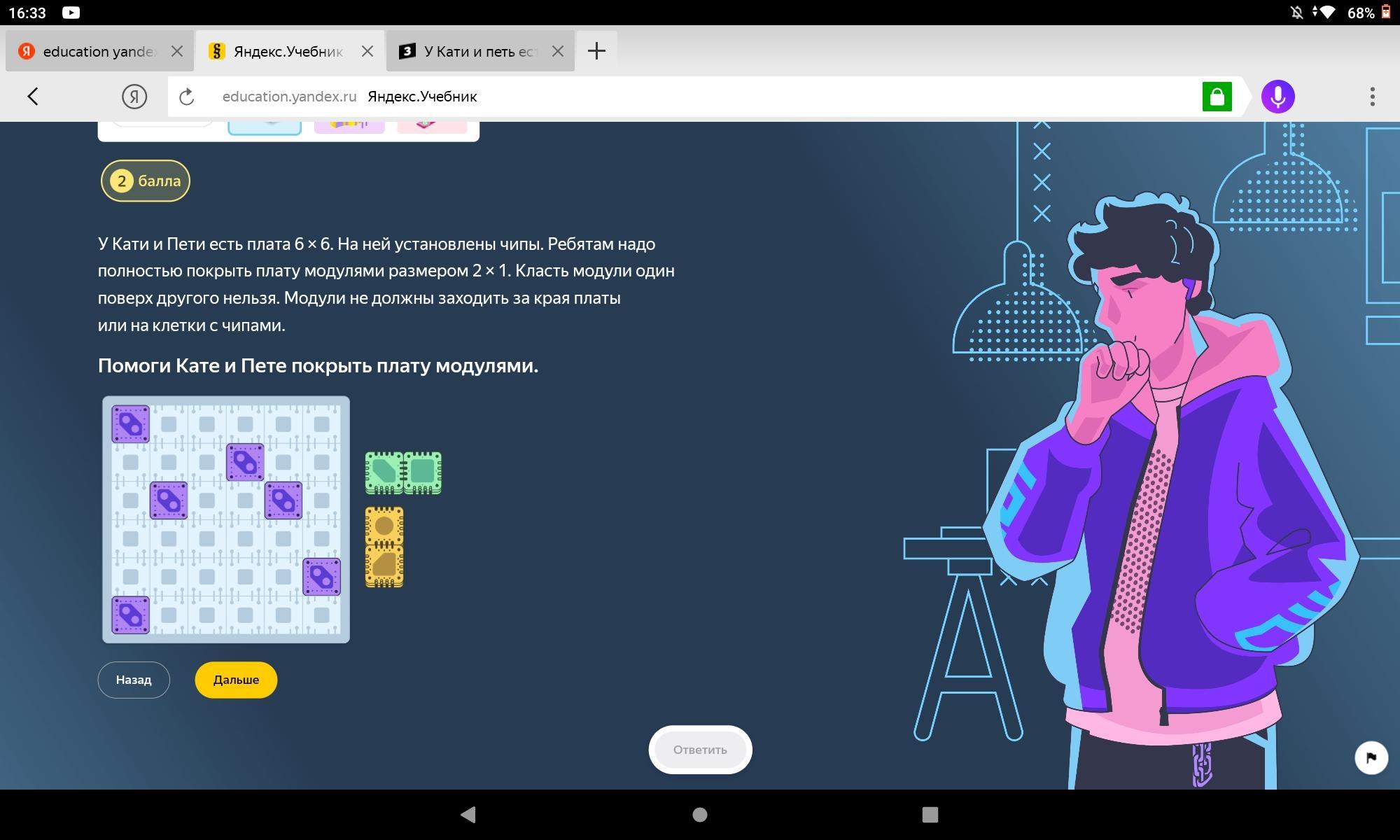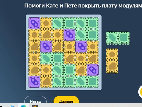У Кати Пети есть платы 6×6. На ней установлены чипы. К ребятам надо полностью покрыть плату модулями размером 2×1. Класть модуль один поверх другого нельзя точка моды не должны заходить за края платы или на клетке с чипами.