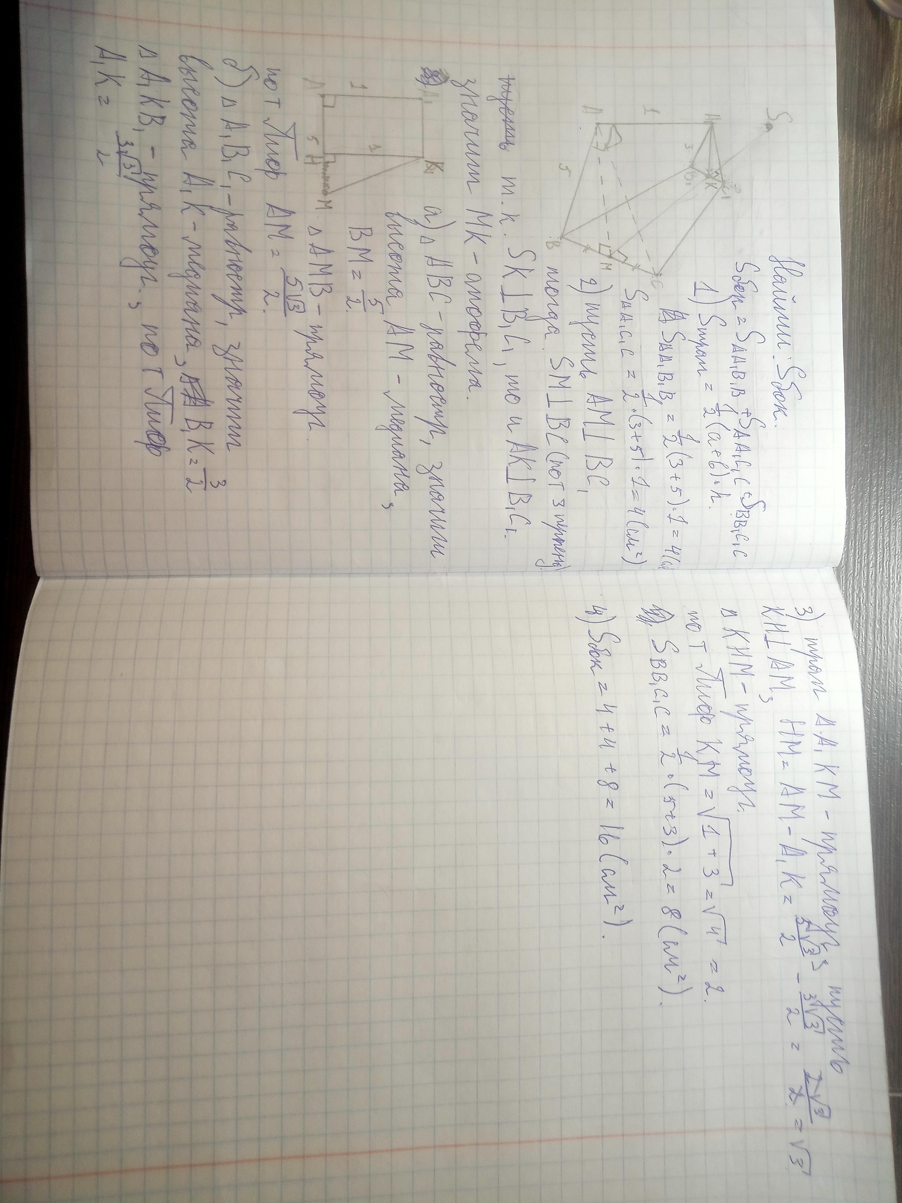 Основанием усечённой пирамиды являются правильные треугольники с сторонами 5 см и 3 см соответственно. Одно из боковых рёбер пирамиды перпендикулярно к плоскостям оснований и равно 1 см. Найдите площадь боковой поверхности усечённой пирам. Это номер 270. Геометрия 10-11 класс