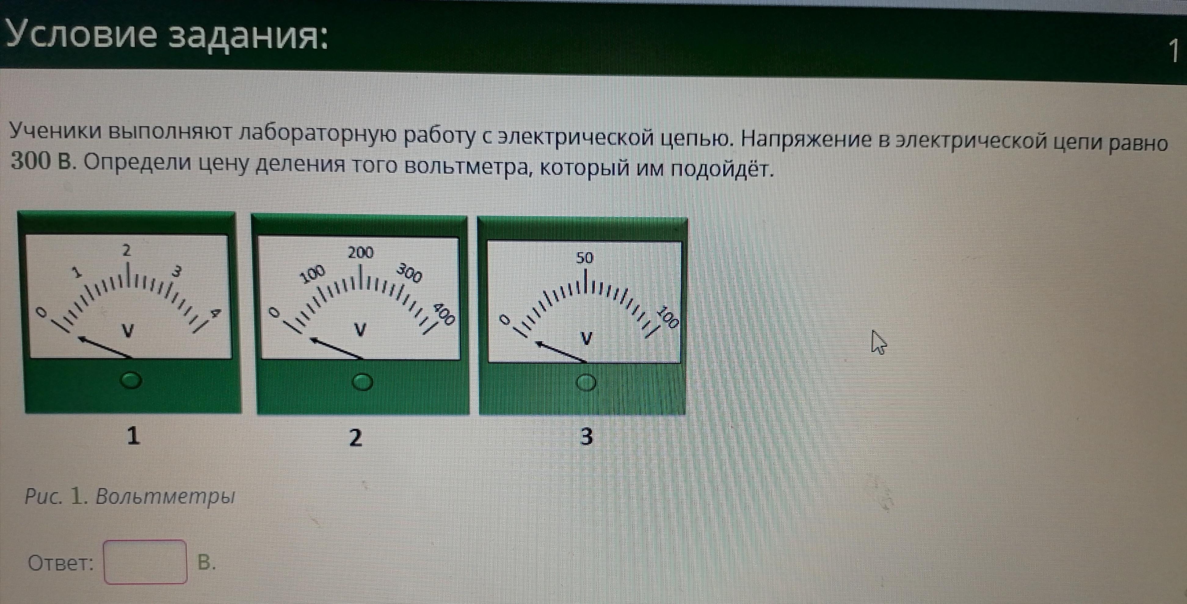 Подойдёт только второй. Его цена деления (300-200)/5=20 В.