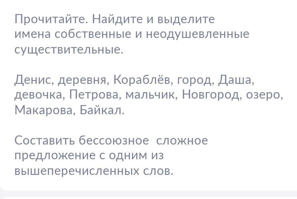 Имена собственные: Денис, Кораблёв, Даша, Петрова, Новгород. Макарова, Байкал.