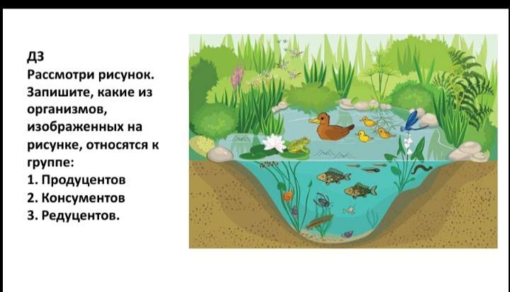 консументы — утки, рыбы, стрекоза, жаба, улитки.