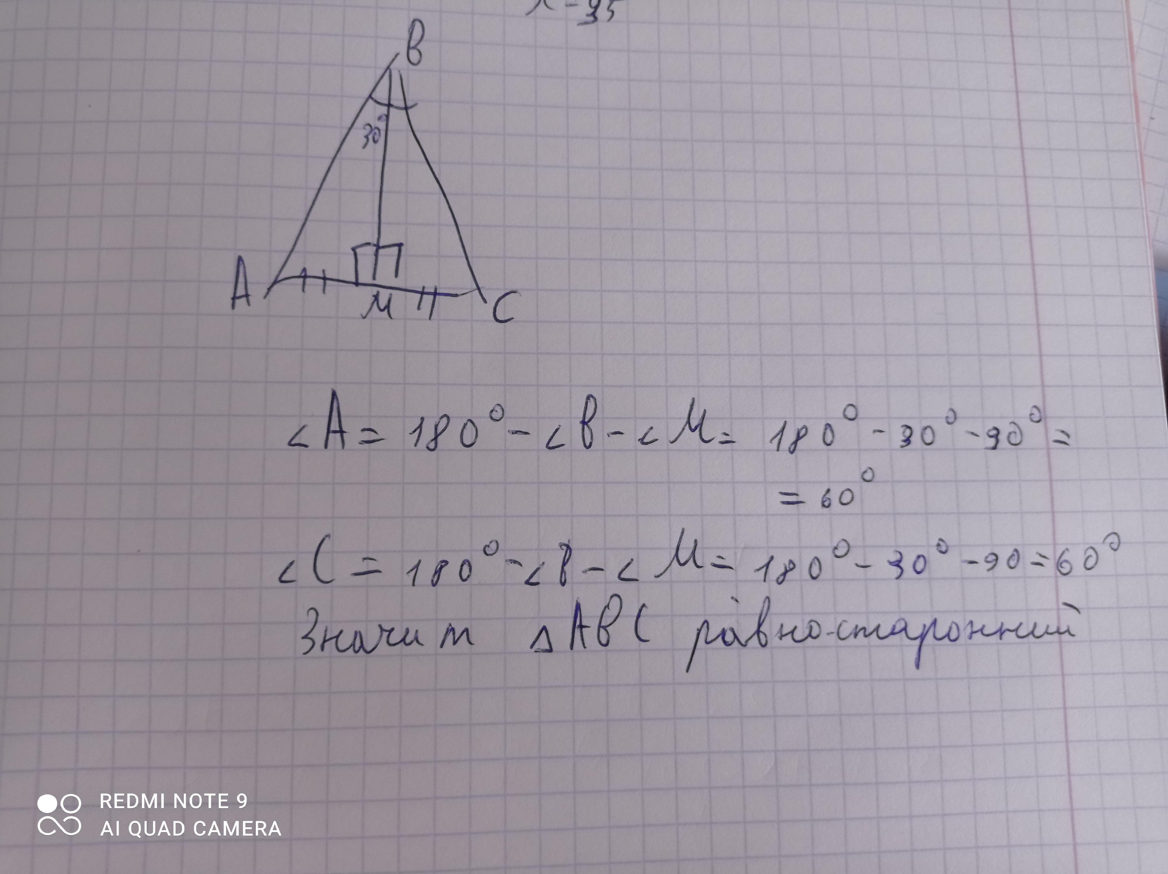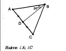 медиана делит треугольник попоплам,итакже является перпендикуларом,значитADB=90.Cледуя из свойства прямоугольного треуголника угол А=90-30=60.Т.К. треугольник равнобедренный,то угол А=углу С=60