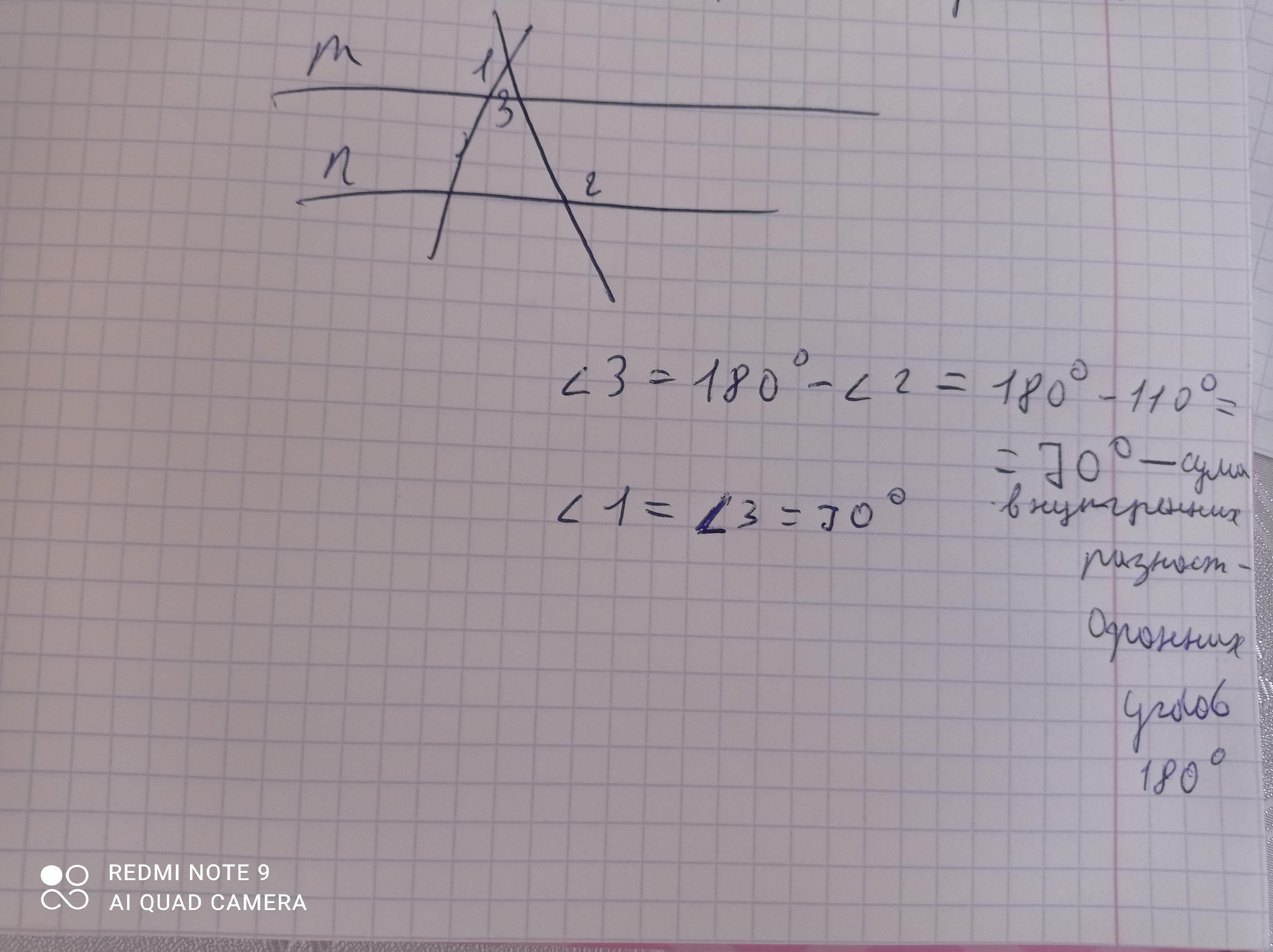 прямые m и n паралленьны. найдите угол 1 если угол 1 равен углу 3, угол 2 = 110 градусов