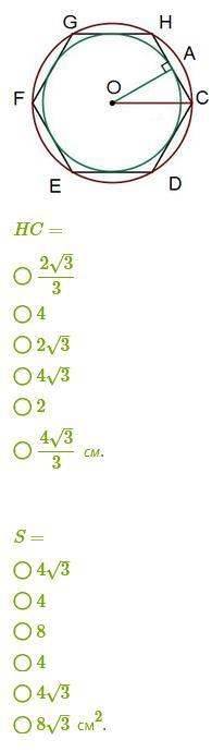 Радиус окружности, вписанной в правильный шестиугольник, равен 2 см. Вычисли сторону шестиугольника HC и его площадь.