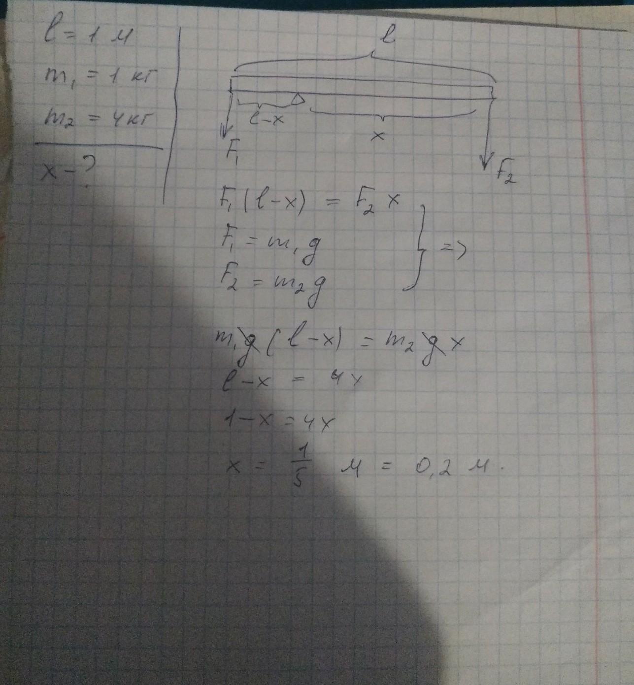 На концах невесомого стержня длиной 1м, имеющего ось вращения, подвешены грузы массами 1 и 4 кг. Стержень с грузами находится в состоянии равновесия в горизонтальном положении. Определить на каком расстоянии от точки подвеса меньшего груза находиться ось вращения стержня