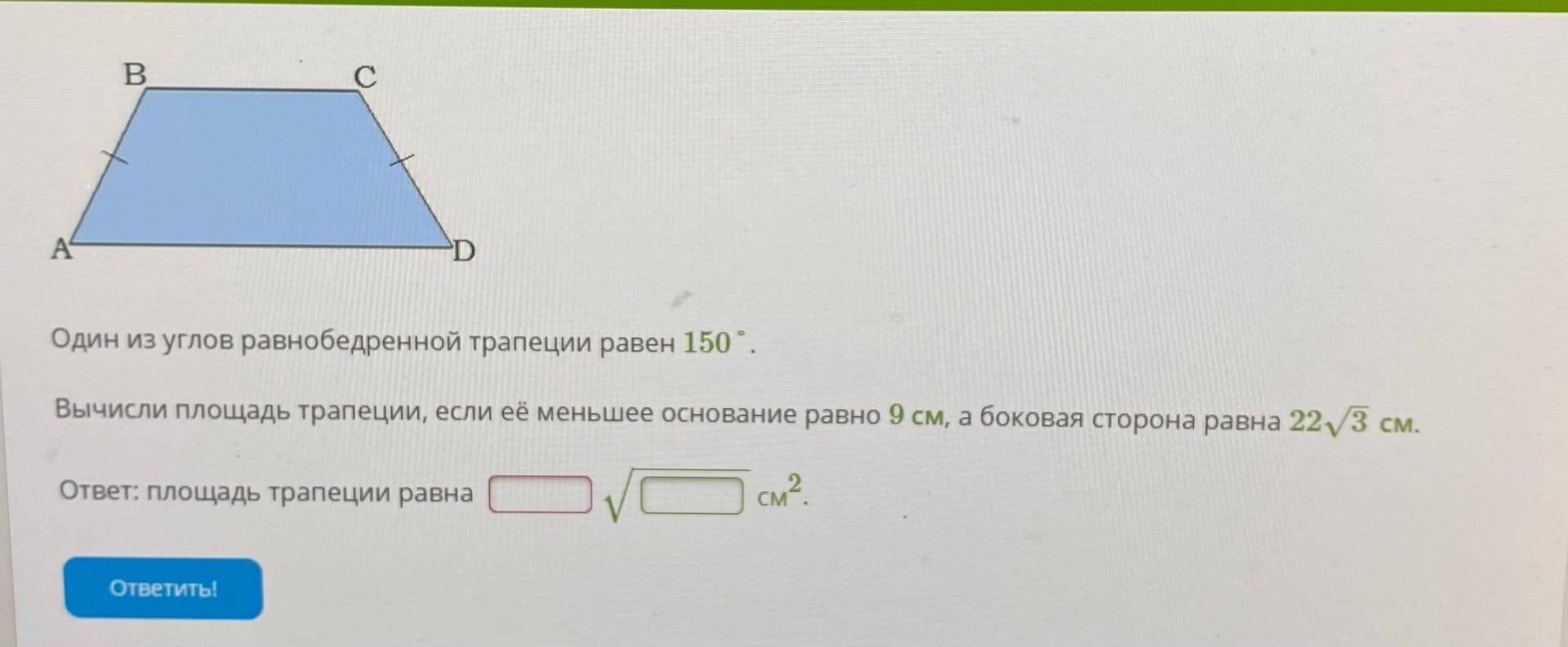 Вычисли площадь трапеции, если её меньшее основание равно 9 см, а боковая сторона равна 22√3 см.